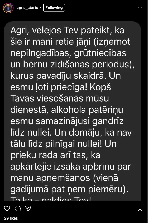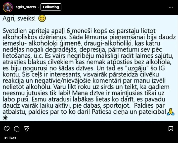 “Tu vairs necīnies ar alkoholu — tu dzīvo brīvībā no tā.”